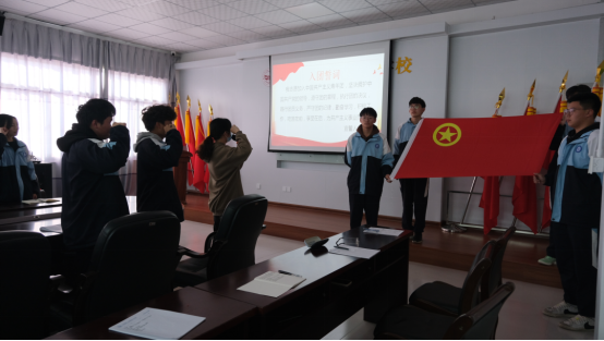 會議最后,全體團員高舉右手,緊握右拳,在團旗下重溫入團誓詞。