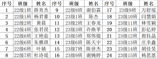 根據(jù)《中國共產(chǎn)主義青年團(tuán)章程》有關(guān)規(guī)定,按照《共青團(tuán)中央關(guān)于印發(fā)<中國共產(chǎn)主義青年團(tuán)發(fā)展團(tuán)員工作細(xì)則>的通知》(中青發(fā)〔2023〕13號(hào))、《共青團(tuán)中央印發(fā)<關(guān)于新時(shí)代新征程加強(qiáng)和改進(jìn)團(tuán)員隊(duì)伍建設(shè)工作的意見>的通知》(中青發(fā)〔2023〕14號(hào))和團(tuán)縣委《共青團(tuán)惠安縣委關(guān)于高質(zhì)量做好2024年上半年全縣發(fā)展團(tuán)員工作的通知》(團(tuán)惠委〔2024〕12號(hào))文件要求。經(jīng)個(gè)人書面申請、班級(jí)推薦、積分入團(tuán)、團(tuán)校培養(yǎng)、結(jié)業(yè)考核和學(xué)校團(tuán)支部審核等環(huán)節(jié),擬確定以下24名學(xué)生為2024年上半年團(tuán)員發(fā)展對象,現(xiàn)將名單進(jìn)行公示,公示期為2024年6月6日至6月13日。