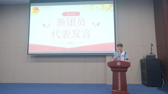 薛育杰同學(xué)作為新團員代表發(fā)言,他表示要忠于誓詞,堅定理想信念,刻苦學(xué)習(xí)、創(chuàng)新實踐,不斷提高自身素質(zhì),并呼吁全體團員們、同學(xué)們攜起手來,以嶄新的姿態(tài)面對未來的挑戰(zhàn)。