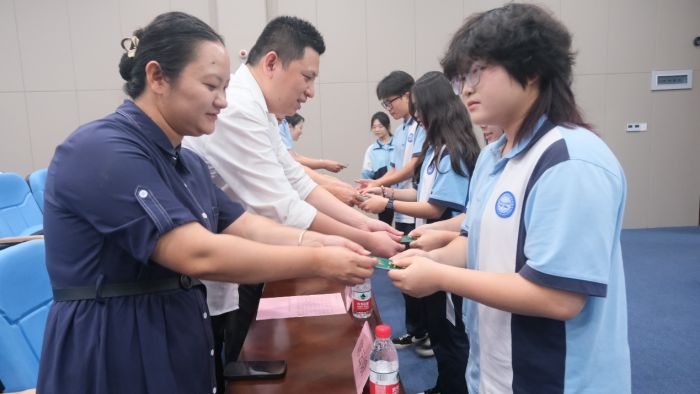 參會的領(lǐng)導(dǎo)、老師為新團員佩戴團徽,頒發(fā)團員證。佩戴上團徽的這一刻,他們成為了共青團的一份子,也肩負起了時代的重任。