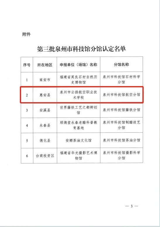 泉州市云揚航空職業(yè)技術(shù)學(xué)校投建的云揚航空科學(xué)館,是具有航空特色的主題研學(xué)教育科學(xué)館。場館占地面積 5000 多平,內(nèi)設(shè)世界航空史展廳、中國航空史展廳、馬尾航空史展廳、航空科普展區(qū)及無人機飛行區(qū)。自2024年開館以來,累計接待游覽、科普研學(xué)、體驗等各類人群達(dá) 50000 多人次,并于2024年6月被授予“泉州市黨史教育基地”,2024年10月入選“惠安縣第三批新時代文明實踐點”,2024年12月被泉州市科協(xié)認(rèn)定為“泉州市科技館分館”。