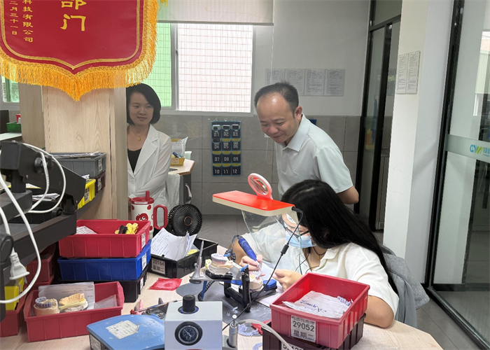 在企業(yè)負(fù)責(zé)人陪同下,杜成達(dá)校長一行首先參觀了超維醫(yī)療科技有限公司的生產(chǎn)車間。在工作人員的引導(dǎo)下,校領(lǐng)導(dǎo)詳細(xì)了解了口腔義齒從原材料處理、數(shù)字化設(shè)計、3D打印成型到精細(xì)打磨、質(zhì)檢包裝的完整生產(chǎn)流程,并實地察看了先進(jìn)的生產(chǎn)設(shè)備與嚴(yán)格的質(zhì)量控制體系,對企業(yè)的專業(yè)化、規(guī)范化管理給予高度評價。
