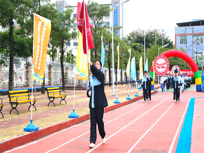 “一二一!一二一!”激昂的口號劃破晴空,國旗隊與校旗隊邁著擲地有聲的步伐率先入場。隊員們身姿挺拔如松,眼神堅定如炬,鮮紅的國旗與校旗在風中獵獵飄揚,不僅彰顯著云揚人對黨和國家的忠誠,更承載著“逐夢青春”的初心與擔當——這是開幕式最莊嚴的序章,也是信仰與榮耀的傳承。