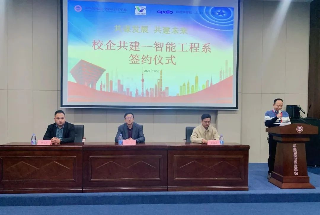 2022年12月21日下午,泉州市云揚(yáng)航空職業(yè)技術(shù)學(xué)校、力文科技(福建)有限公司、阿波羅智聯(lián)(北京)科技有限公司在我校學(xué)術(shù)報(bào)告廳進(jìn)行校企共建智能工程系簽約儀式。我校遲巖校長(zhǎng)、力文科技(福建)有限公司總經(jīng)理劉建清、百度智能交通福建區(qū)域城市總經(jīng)理倪少澤等領(lǐng)導(dǎo)及其他來賓出席了本次簽約儀式,我校杜成達(dá)常務(wù)副校長(zhǎng)主持儀式。