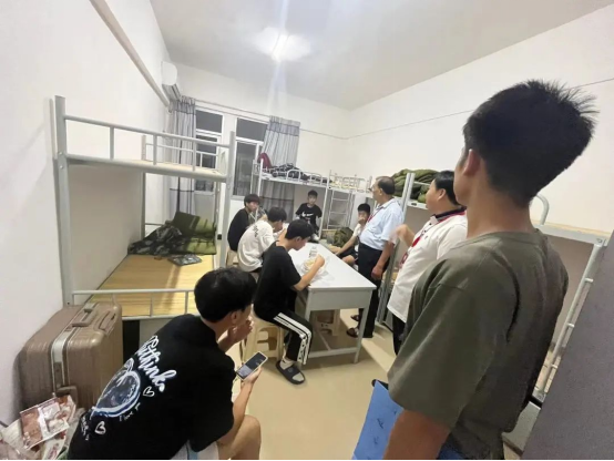 又是一年迎新季,為深入了解新生思想動(dòng)態(tài),幫助學(xué)生調(diào)整心態(tài)盡快融入新學(xué)校、新集體。9月4日晚,陳炳耀副校長(zhǎng)、許碧奎副校長(zhǎng)帶領(lǐng)招就處、全體新生班主任、教官深入宿舍,為我校2023級(jí)新生送去深切關(guān)懷,了解同學(xué)們生活、思想各方面的情況,引導(dǎo)新生盡快適應(yīng)寢室環(huán)境,向新生傳遞了溫暖的問(wèn)候與祝福。